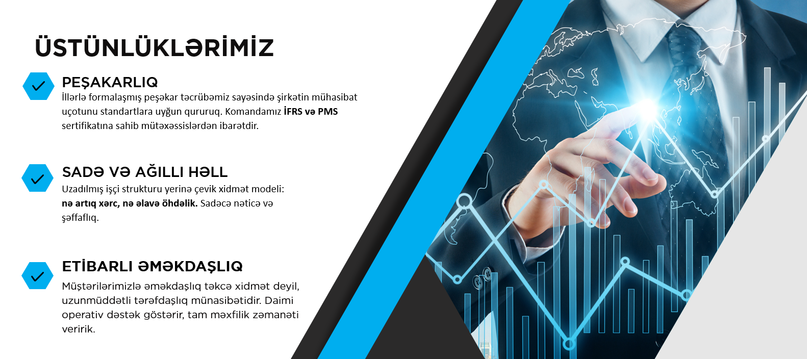 Biz — maliyyə menecmenti və mühasibat uçotu sahəsində ixtisaslaşmış peşəkar komandayıq.